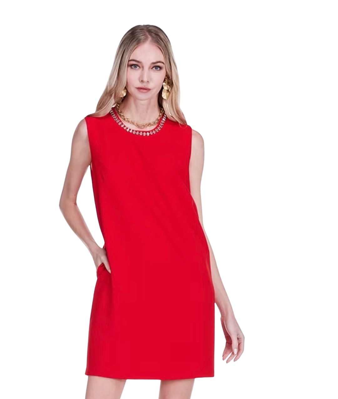Emb Neck Shift Dress, Red